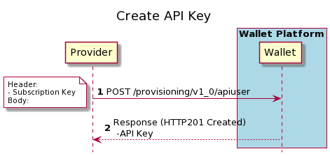 The Provider sends a POST {baseURL}/apiuser/{APIUser}/apikey request to Wallet platform.