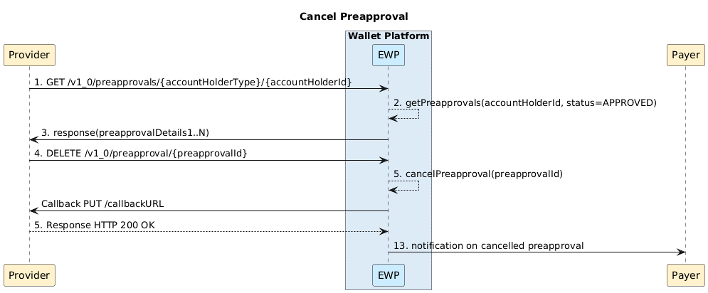 Cancel PreApproval makes it possible for a Service Provider (Merchant) to cancel a preapproval that is targeting the Service Provider itself.